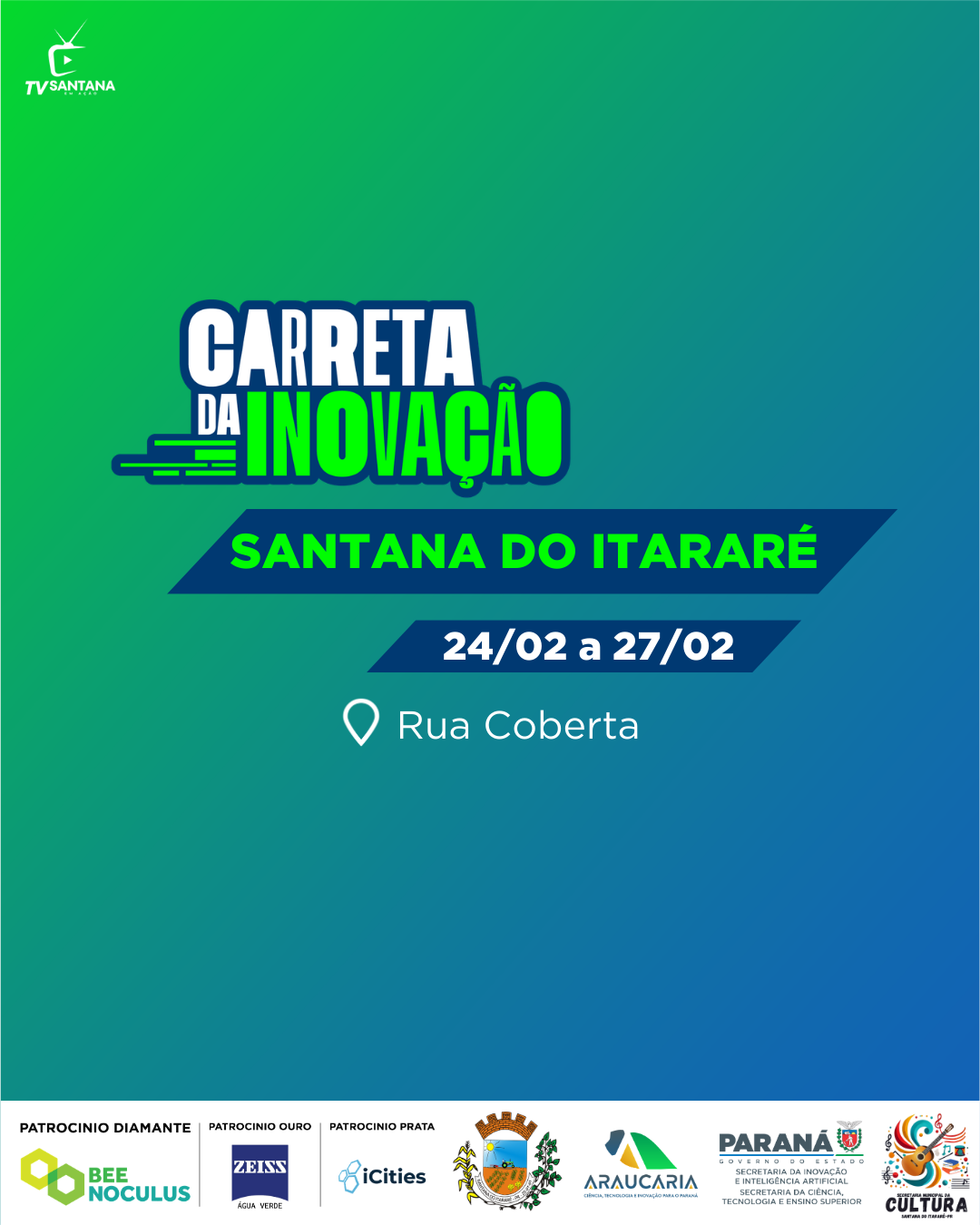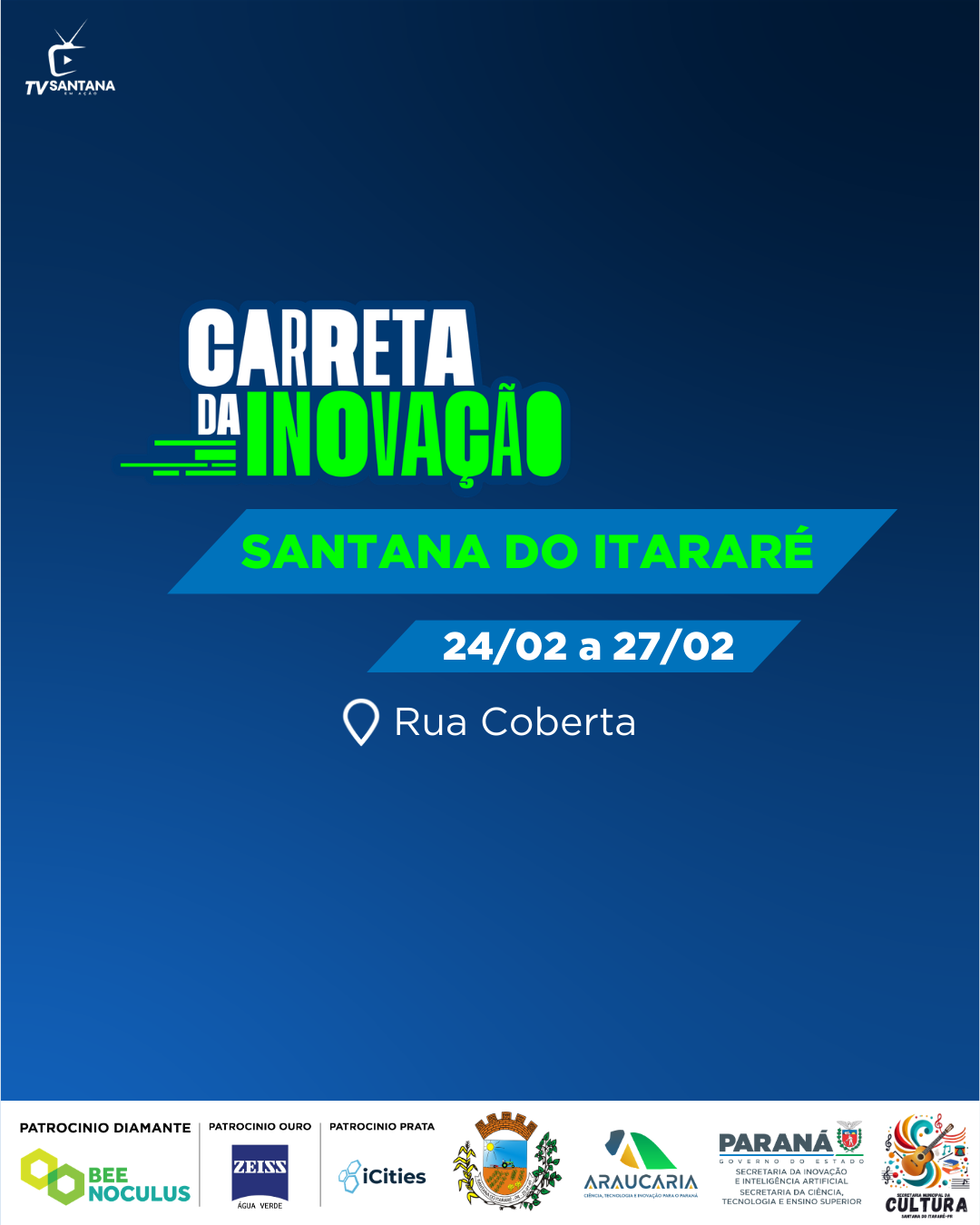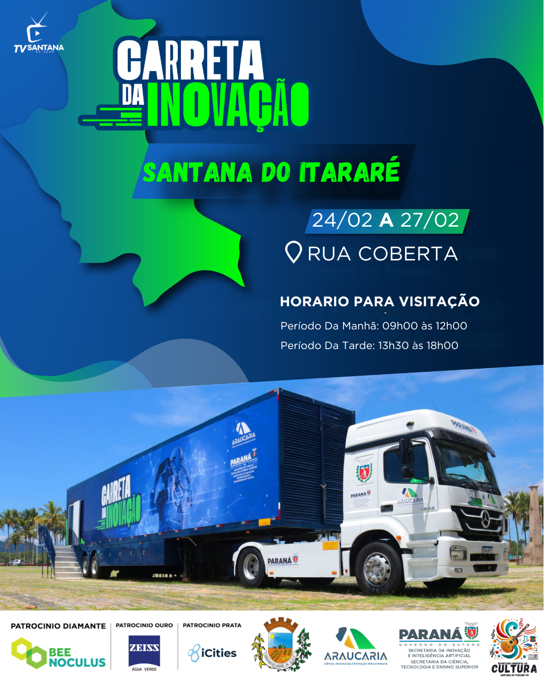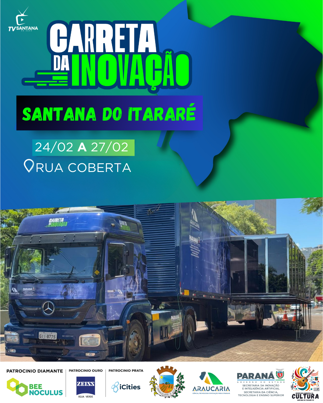 A população de Santana do Itararé está recebendo, nesta semana, um importante projeto voltado ao conhecimento e à inovação. A Carreta da Inovação está instalada na Rua Coberta, no centro da cidade, e permanece no município entre os dias 24 e 27 de fevereiro de 2026, com visitação gratuita aberta à comunidade.